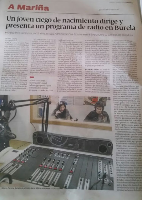 Un primeiro directo que foi un “bonito desastre”, recordan entre risas, pois aínda que ambos tiñan experiencia –Helena ten outro programa na mesma emisora– coordinarse non foi fácil, porque a lectura en braillie é máis lenta. “Tocáballe non brazo para avisalo de que tiña que falar e axudábaoo se sw perdía co guion”, recorda Helena, que é un auténtico bulebule de actividade e converteuse na compañeira perfecta para Marco, moito máis tranquilo.